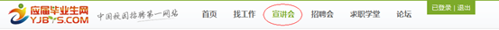 1)進(jìn)入應(yīng)屆畢業(yè)生網(wǎng)(www.x-im.cn )首頁(yè),在網(wǎng)站首頁(yè)頂部導(dǎo)航欄點(diǎn)擊“宣講會(huì)”,即可進(jìn)入“YJBYS宣講會(huì)查詢系統(tǒng)”,你也可以輸入 直接進(jìn)入該系統(tǒng)。