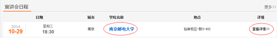 即可進(jìn)入公司的宣講會(huì)詳情內(nèi)容頁(yè)面,你可以從該頁(yè)面獲取到該場(chǎng)宣講會(huì)的所有必要信息。如點(diǎn)擊南京郵電大學(xué)或右邊的查看詳情,可以看到下圖的頁(yè)面: