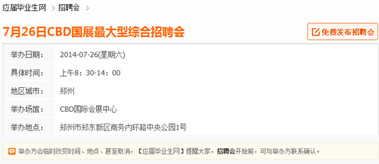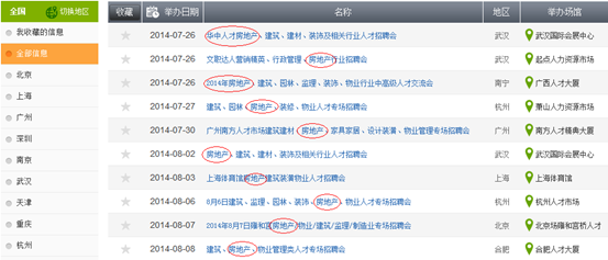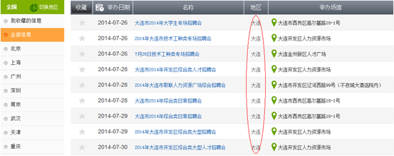 第三步:如果你希望找到某一天同時(shí)舉行的招聘會(huì)信息,你可以在舉辦日期那里選擇舉辦日期,例如選擇2014/7/26,你將可以得到26號(hào)當(dāng)天舉行的所有招聘會(huì)信息,結(jié)果如下: