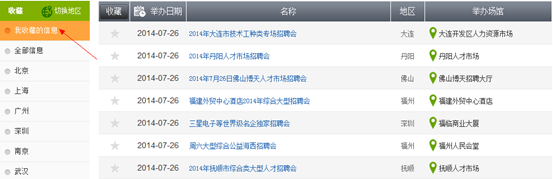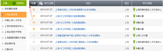 第五步:如果您想避免再次搜索自己感興趣的招聘信息帶來(lái)的麻煩,您可以在點(diǎn)擊招聘會(huì)舉辦日期前面的☆,然后在點(diǎn)擊“收藏”便可把您感興趣的信息收藏到“我收藏的信息”里面: