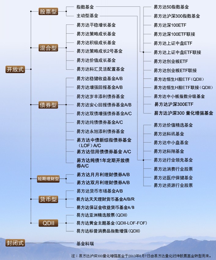 截至2012年9月30日,易方達旗下共管理37只開放式基金、1只封閉式基金,涵蓋主動型股票基金、完全復制型指數(shù)基金、增強型指數(shù)基金、混合型基金、債券型基金、貨幣市場基金等多種類型。