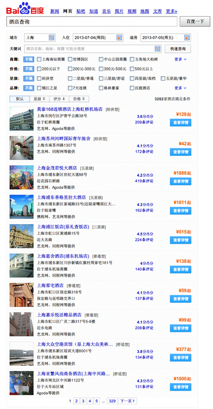 權(quán)威酒店查詢:(百度酒店查詢),求職者可以事先查好來到上海后目的地附近的酒店名稱及所在位置,下車后直奔酒店訂好房間住下。下圖為百度酒店查詢頁(yè)面,供求職者參考。