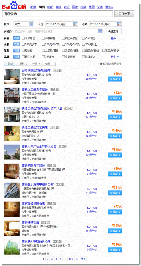 權威酒店查詢:(百度酒店查詢),求職者可以事先查好來到西安后目的地附近的酒店名稱及所在位置,下車后直奔酒店訂好房間住下。下圖為百度酒店查詢頁面,供求職者參考。